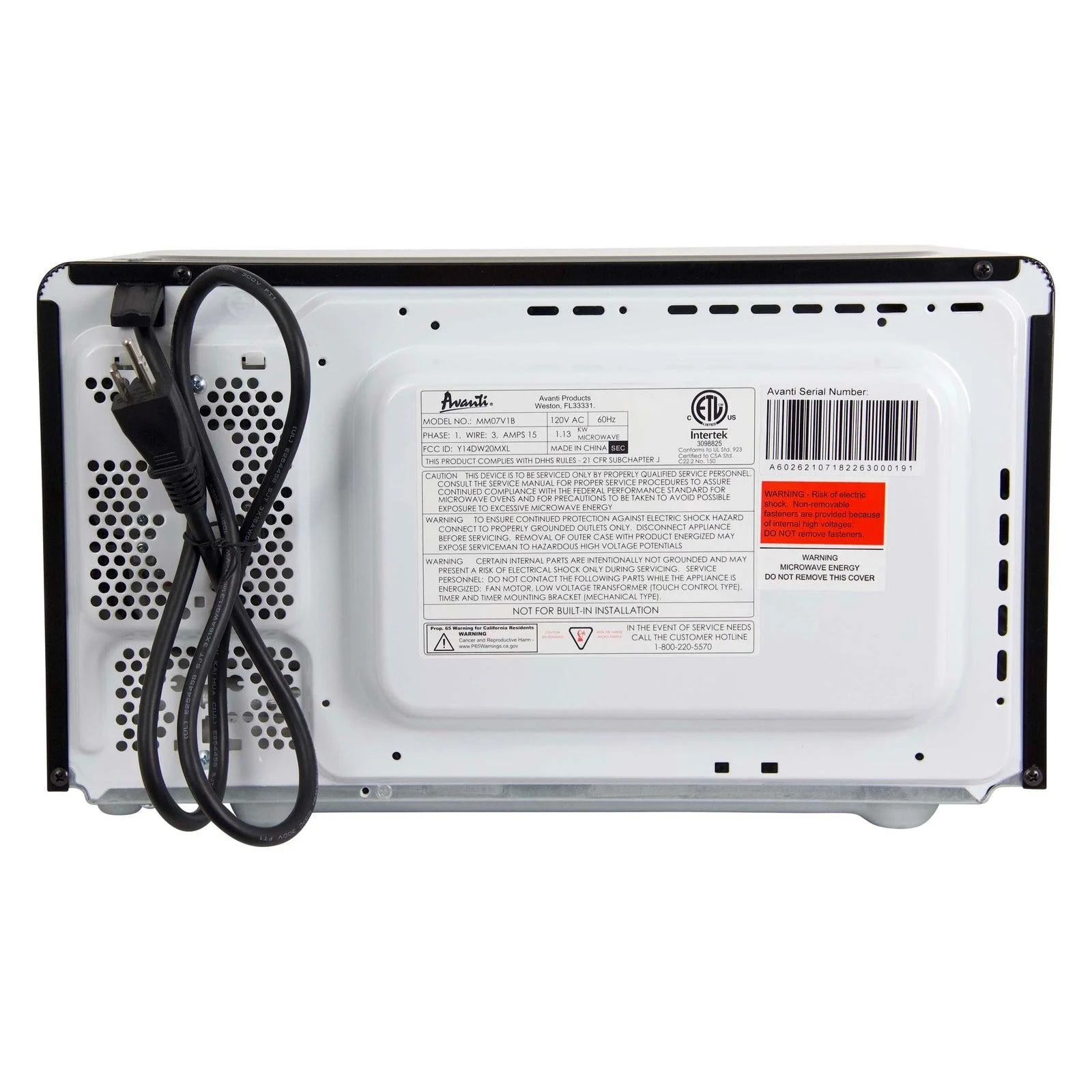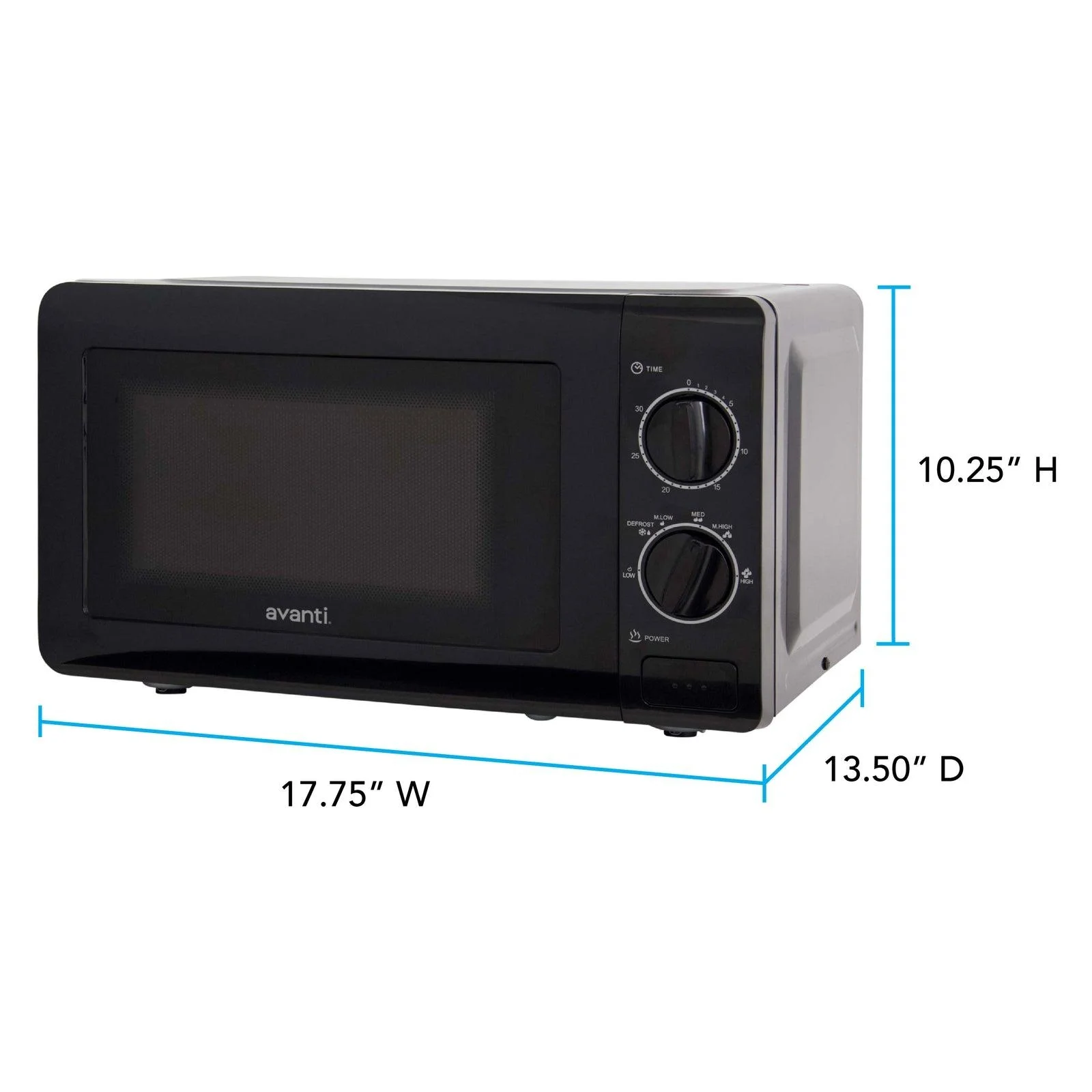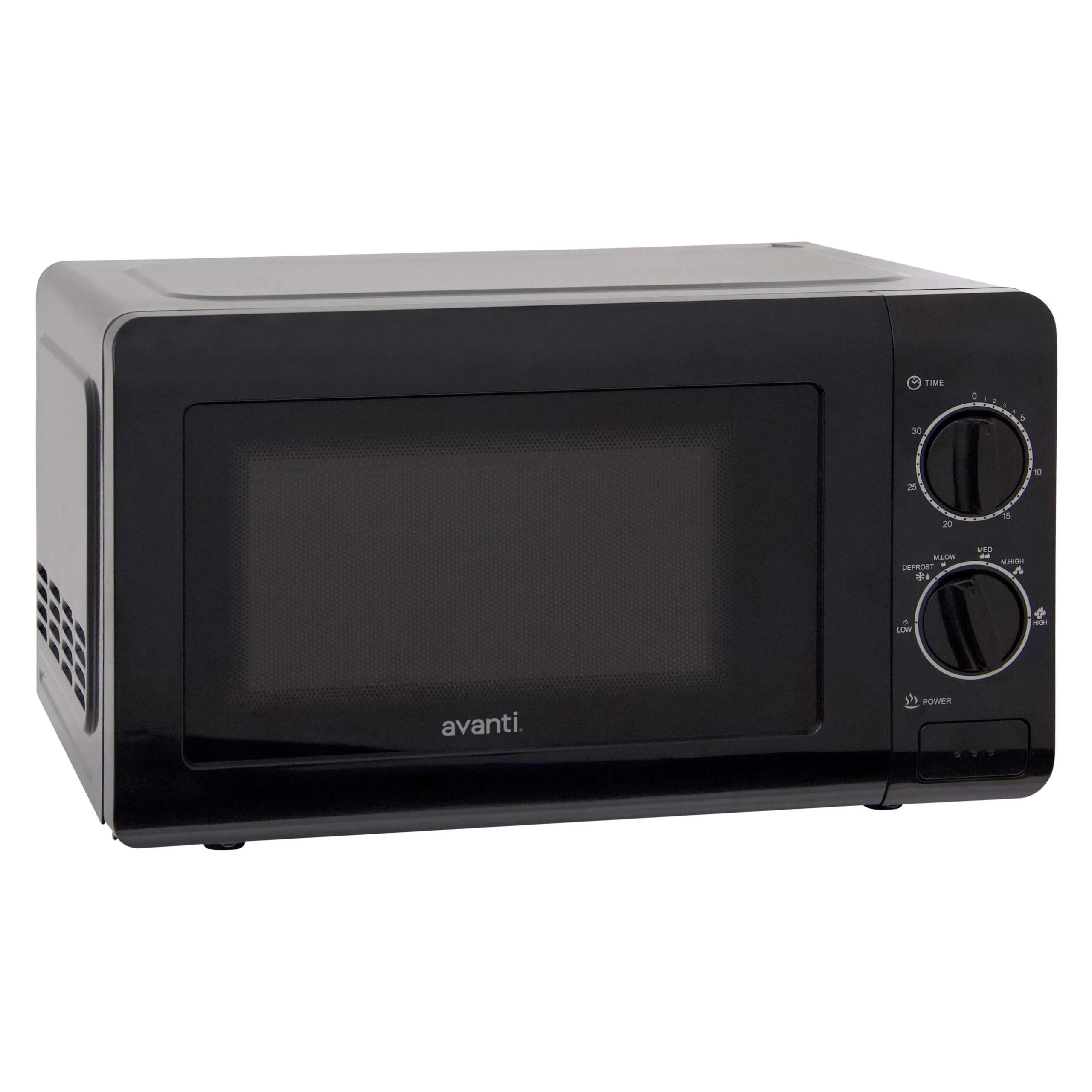 0.7 cu ft capacity, 700 watts of power for cooking and reheating, Five power settings (low, med low, medium, med high, high), Defrost setting, 30-minute cooking timer, Removable glass turntable, Push button door release, Black microwave complements any decor, Covered by the the Avanti One-Year Limited Warranty